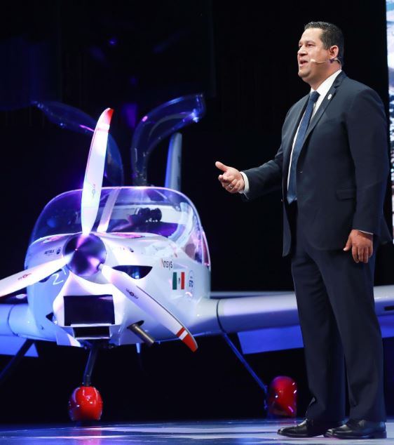 Y esto me da pie, para platicarles de esto que tenemos aquí cubierto. Con ustedes el primer avión cien por ciento mexicano: “Made In Guanajuato”.