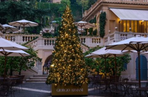 Para celebrar la temporada al más puro estilo italiano, este icónico hotel en Roma enlaza una colaboración con la casa de modas italiana para dar vida a un símbolo que decora el patio de la propiedad. Entre sus ramas destacan esferas doradas y luces brillantes, mismas que están inspiradas en la decoración de la boutique de Giorgio Armani en Via Condotti.