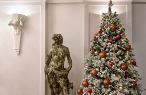 Dos enormes árboles de Navidad con grandes decoraciones en tonos oro y rojo reciben a los visitantes en esta exclusiva propiedad enclavada en el corazón de Florencia. En su creación intervino la firma de joyería Pomellato. La decoración que palpita un ambiente festivo mantiene los colores propios del sello italiano.