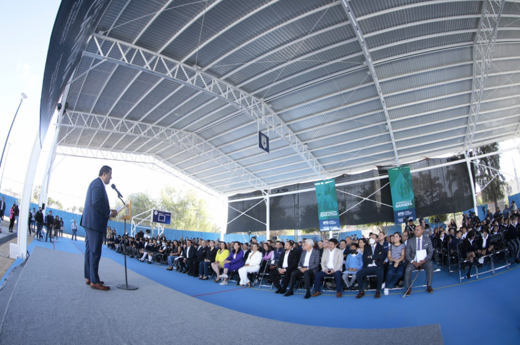 Diego Sinhue Rodríguez Vallejo también estuvo presente en la ceremonia de Honores a la Bandera en la Escuela Primaria Josefina Juárez de La Rosa (turno matutino) y Antonio Madrazo (turno vespertino), en donde entregó infraestructura educativa.