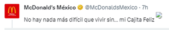 Entre los comentarios, destacó el de la comida rápida que hábilmente respondió: “No hay nada más difícil que vivir sin… mi Cajita Feliz “, retomando el sencillo “Si no te hubieras ido» que se lanzó en 1999.