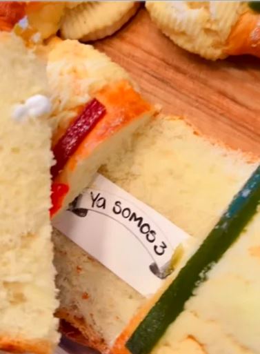 En la publicación se observa un clip en el que ella corta un pedazo de la tradicional rosca de Reyes, lo curioso es que bajo el esponjoso pan se encontraba una nota que decía: “Ya somos tres”