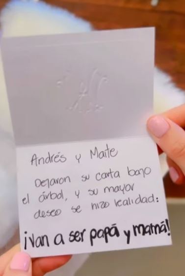 Pero el anuncio no acabó ahí, ya que posteriormente se alcanzan a percibir unas botas navideñas en las que venía un sobre con el mayor deseo de la enamorada pareja: “Andrés y Maite. Dejaron su carta bajo el árbol y su mayor deseo se hizo realidad: «¡Van a ser papá y mamá!».