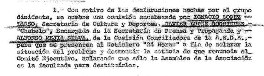 “Con motivo de las declaraciones hechas por el grupo disidente, se nombra una comisión encabezada por Ignacio López Tarso, secretario de Cultura y Deporte; Javier López “Chabelo”, encargado de Prensa y Propaganda, para que se presenten en el Noticiero “24 Horas”, a fin de aclarar la situación del problema y desmentir la noticia de que renuncia el Comité Ejecutivo, aclarando que sólo la Asamblea de la Asociación es la facultada para destituirlos”, detalla.