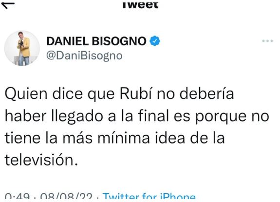 Ante ello una importante figura de TV Azteca ha salido en su defensa, dejando entrever que podría ser un Rubiliver, como se hacen llamar los fans de la cantante. Daniel Bisogno expresó su sentir sobre los resultados de la semifinal, asegurando que todos aquellos que no cuestionan su pase a la gran final del domingo 14 de agosto, no tienen idea de cómo es que se hace la televisión en México.