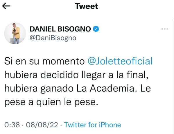 “Si en su momento @Joletteoficial hubiera decidido llegar a la final, hubiera ganado La Academia. Le pese a quien le pese”, escribió el conductor de Ventaneando recordando el popular y famoso caso de la participante de la cuarta generación.