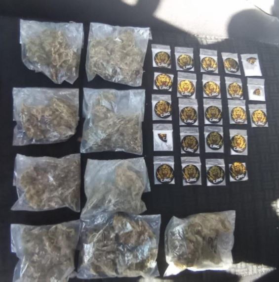 Al momento de la detención se les aseguró una motocicleta con el número de serie con alteraciones y sin placas de circulación; un arma de fuego, un cargador y cinco cartuchos; 23 envoltorios de presunto cristal y 9 de al parecer marihuana.