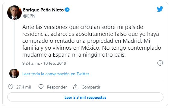 Peña Nieto, en cualquier caso, optó por irse al igual que hicieron, en los últimos 30 años, otros dos presidentes priistas: Carlos Salinas de Gortari (1988-1994) se estableció en Irlanda al poco tiempo de acabar su mandato y Ernesto Zedillo (1994-2000) se fue para ejercer la docencia en la Universidad de Yale, en Connecticut. Las informaciones sobre su decisión de abandonar México empezaron a circular a principios de 2019, meses después de ceder el testigo a su sucesor y rival político, Andrés Manuel López Obrador. Sin embargo, el exmandatario nunca lo ha reconocido públicamente y hasta llegó a negarlo a través de Twitter, en febrero de ese año. “Es absolutamente falso que yo haya comprado o rentado una propiedad en Madrid”. En ese mensaje aseveró que vivía en México con su familia y que no tenía contemplado mudarse “a España ni a ningún otro país”. Entonces no mentía, porque aún no había solicitado su residencia en España. Lo hizo algunos meses después.