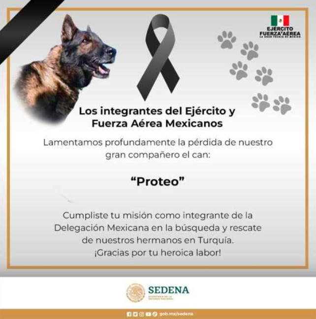 “Cumpliste tu misión como integrante de la Delegación Mexicana en la búsqueda y rescate de nuestros hermanos en Turquía. ¡Gracias por tu heroica labor!”, expresó la Secretaría de la Defensa Nacional (Sedena) en su mensaje de despedida para Proteo, el binomio canino rescatista que falleció esta madrugada en su cumplimiento de labor.