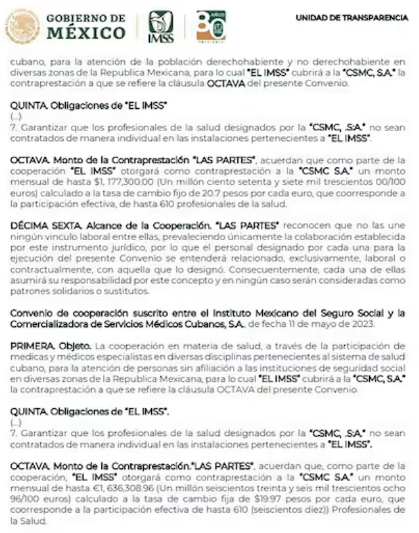 El acuerdo se llevó a cabo entre el IMSS y la Comercializadora de Servicios Cubanos, S.A., una empresa privada de Cuba que gestiona la exportación de servicios médicos. El pago total, equivalente a 23 millones de euros, fue distribuido en tres convenios firmados entre julio de 2022 y diciembre de 2023. Sin embargo, el IMSS desconoce cuánto de este monto se destina directamente al salario de los 610 médicos cubanos contratados, ya que dicha información es manejada por la empresa cubana.