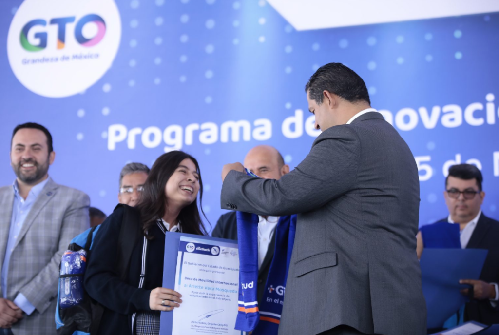 En esta ceremonia se anunció el otorgamiento de becas para 60 estudiantes de la Red de Jóvenes CECyTE Guanajuato al programa “Más Guanajuato en el Mundo”.