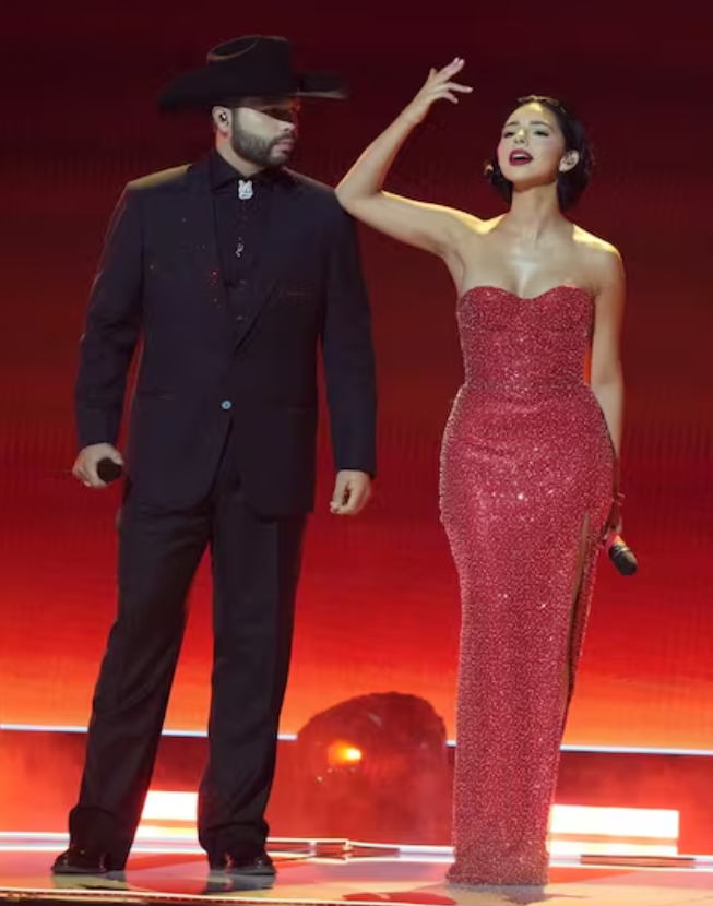 Como era de esperarse, Ángela Aguilar acaparó todas las miradas desde su llegada a la alfombra roja. Con un vestido inspirado en los años 20, en color champagne y decorado con pedrería plateada, Ángela lució espectacular. Acompañada de su esposo Christian Nodal, protagonizó un momento tierno cuando él arregló cuidadosamente su vestido, un gesto que recordó a los fans el cariño que Nodal mostró con Cazzu en la edición anterior.