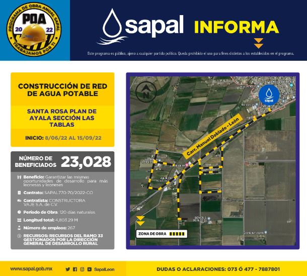 Para la construcción de la infraestructura, SAPAL contempla 120 días de actividades, tiempo en el que instalará más de 4 mil 803 metros de tubería de agua potable. En estas actividades, SAPAL detona 267 empleos directos y más de dos mil indirectos.