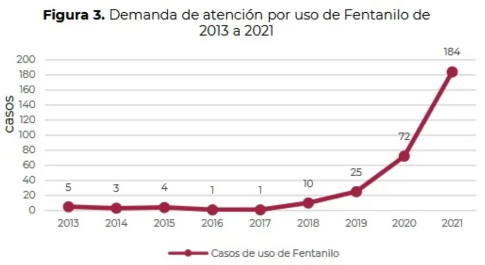 El primer registro, en 2013, contempló un total de cinco casos de uso de fentanilo en todo el país. La tendencia se mantuvo a la baja hasta 2018, año en que la cifra llegó a diez. En 2019 se contabilizaron 25 casos, en 2020 fueron 72 y, finalmente, 2021 cerró con una cifra de 184 reportes de uso de esta droga.
