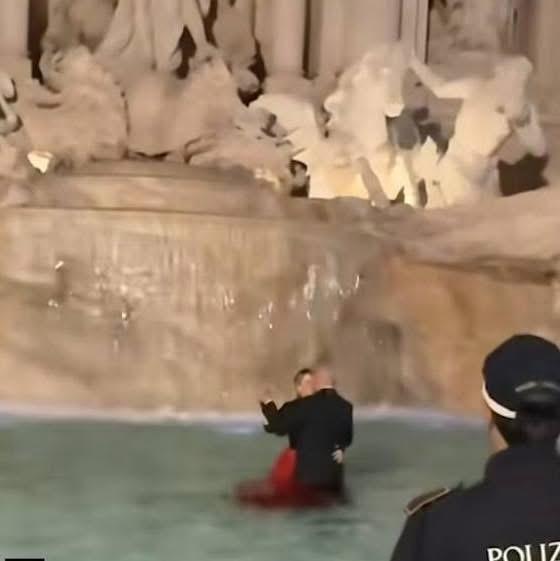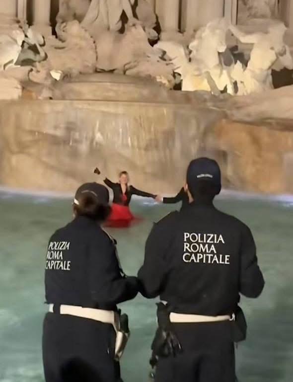 Según testigos, la pareja cruzó el borde de la icónica fuente y entró directamente al agua con el objetivo de capturar una fotografía “especial” de su viaje. Aunque muchos lo interpretaron como un gesto romántico, la acción violaba de manera clara las normas de protección del monumento histórico.