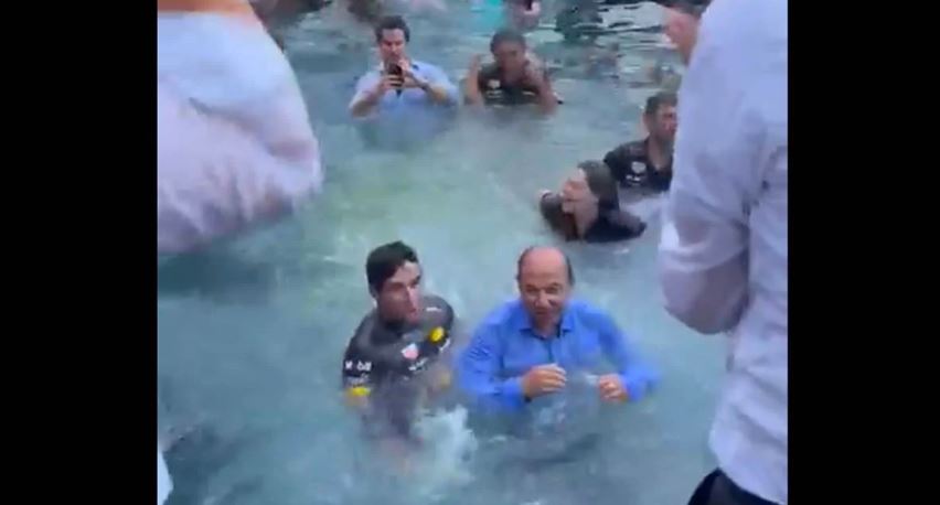 INFLUENCER GTO Ayer por la tarde se hizo viral un video en el que Sergio Pérez cumplió con la tradición, tras imponerse en el Gran Premio de Mónaco, y se tiró un chapuzón para festejar la victoria, pero llamó la atención que —minutos después— apareció el expresidente Felipe Calderón, con quien el piloto tapatío también se aventó un clavado.