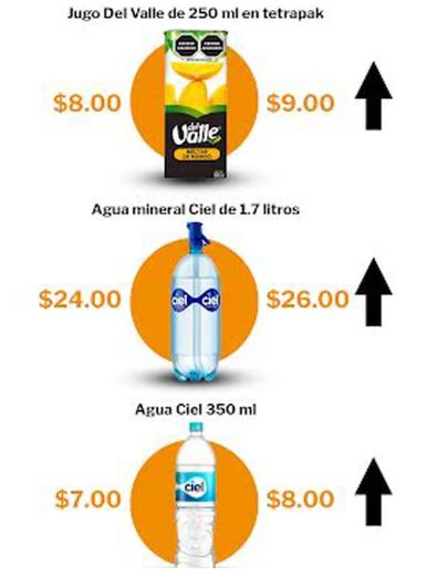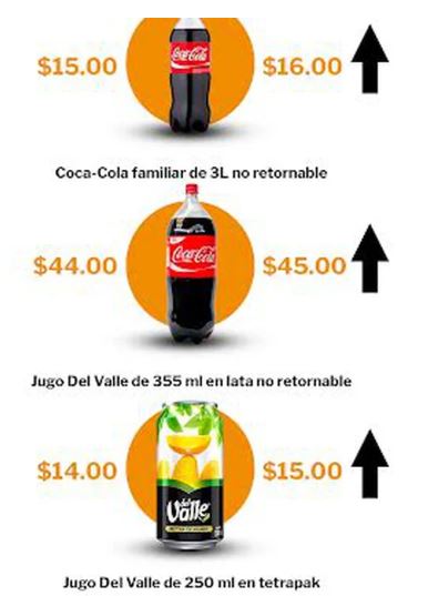 Además, otros productos como los Jugos Del Valle, el agua Ciel y las bebidas con electrolitos y energizantes como Monster o Powerade, aumentaron sus precios entre un 6 y 17%. Dicho incremento se debe a las presiones inflacionarias en varias de sus materias primas, pues como la mayoría de las empresas, se han enfrentado a su incremento de precios (de las materias primas) que utilizan para elaborar los productos.