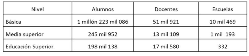 Las alumnas y alumnos de los niveles de preescolar, primaria y secundaria son atendidos por 51 mil 921 docentes, en 10 mil 469 escuelas. Los protocolos para el buen regreso a clases se mantendrán con apoyo de las madres y padres de familia en los comités participativos de salud escolar que han sido de alta relevancia para que las decisiones se perfecciones en función del contexto de cada plantel educativo.