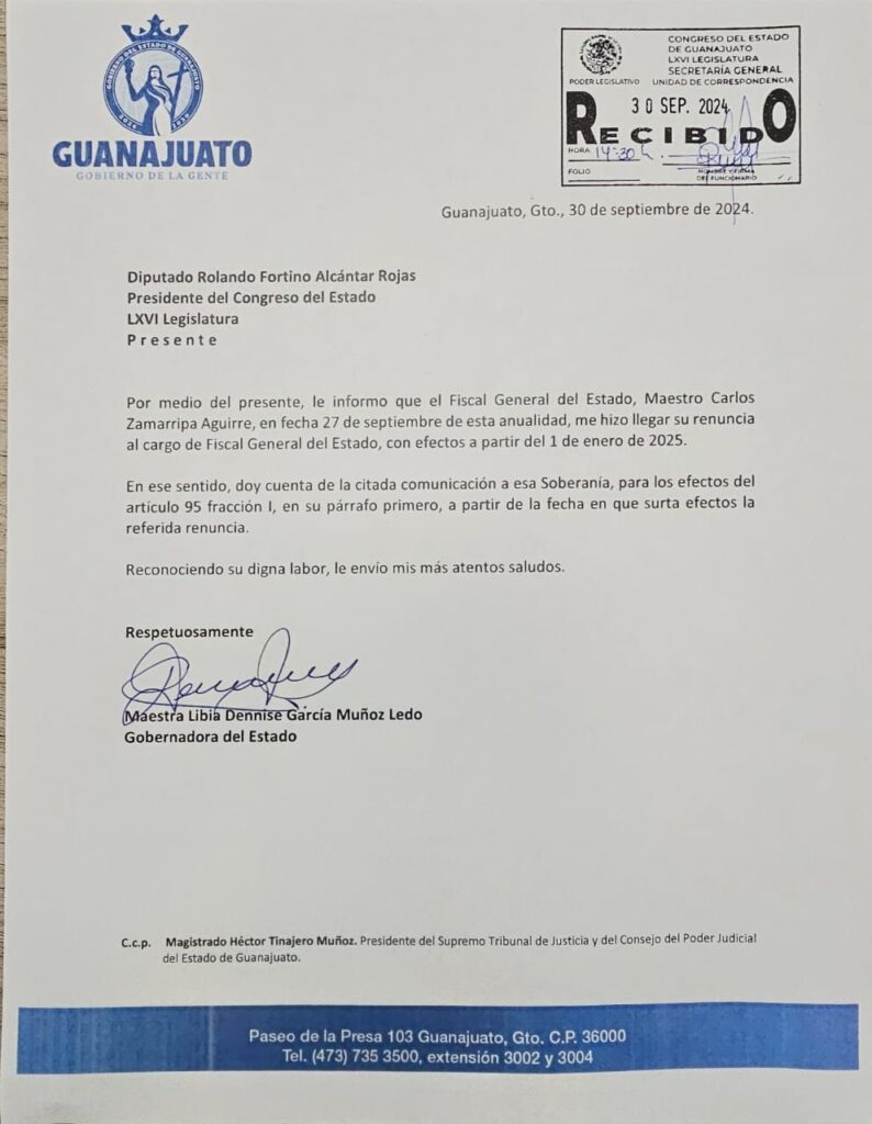 Según el documento compartido, Carlos Zamarripa expresó su intención de dejar el cargo desde el 27 de septiembre. A partir de esta fecha, la gobernadora informó al Congreso de Guanajuato, y si procede, la renuncia será efectiva el 1 de enero de 2025.