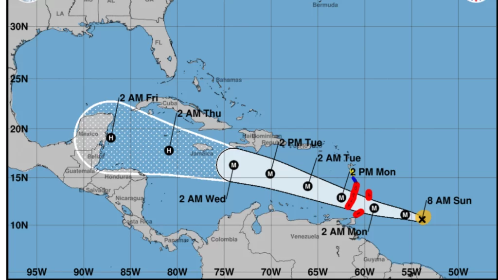 Se espera que Beryl llegue a las islas de Barlovento entre este domingo y la mañana del lunes, con vientos de 215 km/h y ráfagas aún más fuertes. Las islas que deben estar en máxima alerta incluyen Barbados, Santa Lucía, San Vicente y las Granadinas, Granada y Tobago.